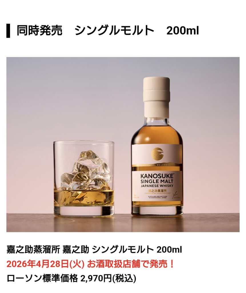 同時発売でローソンでは200mlのミニボトルで「嘉之助 シングルモルト」が2970円で売られていました。フルボトル換算で10395円なので特別割高ではないので気になってた方は是非こちらも手に取って飲み比べして欲しいですね。