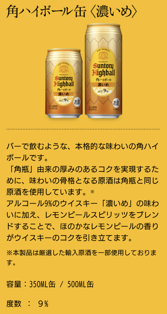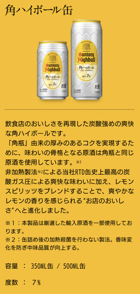 ノーマル角ハイはレモン&酸味料が目立ち過ぎです。7%なのでそんなアルコール感強くないハズなのにこんなレモンでマスクする必要ありますか?飲み応えと飲みやすさのバランスは流石王道角ハイだなって感じですが、僕は酔ってても最後まで人工的な酸味が気になりました。